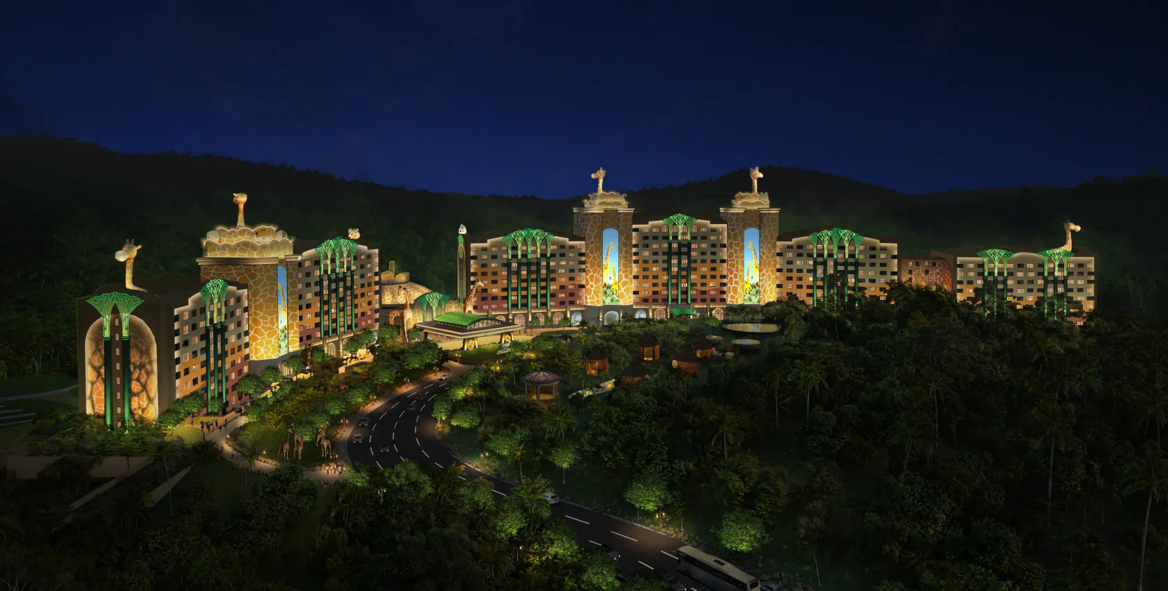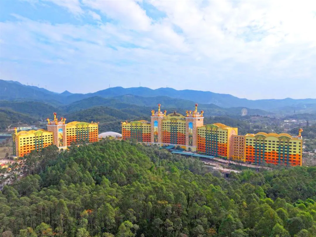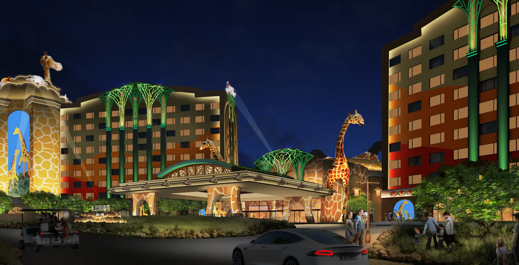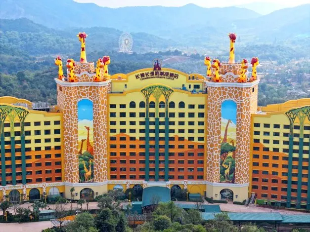 清远长隆长颈鹿酒店定位为高端亲子主题酒店,其主题取材于长隆原创动画片《卡卡虎大冒险》中长颈鹿“酋长一家”的故事。酒店以沉浸式动物主题体验为核心,深度融合度假区的森林生态与野生动物元素,采用“非洲草原 + 森林探险”的主题概念,并结合清远本地生态特色,打造具有鲜明辨识度的差异化度假体验。